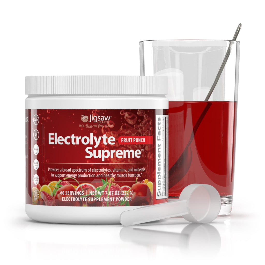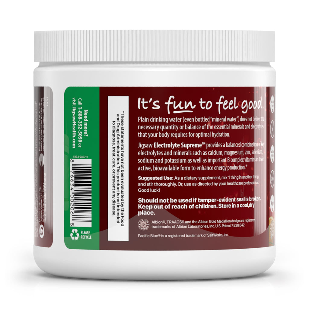 Jigsaw Electrolyte Supreme™ contains a broad spectrum of electrolytes, minerals and vitamins in each serving. Replenish and rehydrate your body by adding one scoop of Jigsaw Electrolyte Supreme™ to your water for a refreshing and nourishing energy-boosting beverage.